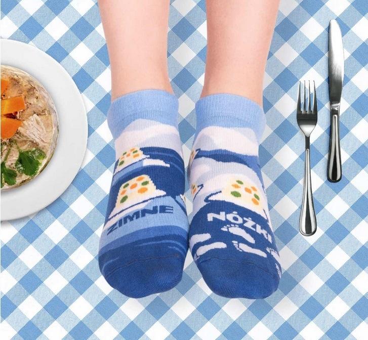 Marchewka czy groszek? Oto jest pytanie! ZIMNE NÓŻKI to zmora zmarzluchów i gości u cioci na imieninach. Z myślą o nich stworzyliśmy skarpetki przywołujące na myśl mroźne zimy w czasach PRL-u i tamte prywatki. Skarpety stopki ZIMNE NÓŻKI to idealny wybór dla każdego zmarzlucha i miłośnika kuchni polskiej. Podaruj je osobie, której zimno w stópki. Dla waćpani i waćpana Skład: 80% najwyższej jakości bawełna czesana, 17% poliamid (dodaje wytrzymałości), 3% elastan (skarpetka lepiej dopasowuje się do stopy) Nieuciskający ściągacz i komfortowy płaski szew na palcach Wyprodukowano w Polsce Prać zawsze na lewej stronie w temperaturze maks. 40° C, nie prasować.