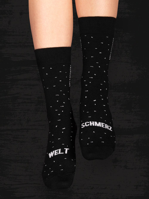 Jeśli jesienno-zimowa aura sprawia, że walka z kołdrą jest wyjątkowo nierówna, a szaruga za oknem wywołuje w Tobie ból istnienia, skarpetki z wymownym napisem WELTSCHMERZ są właśnie dla Ciebie. A jeśli ten napis nie oddaje w pełni Twojego nastroju, to na spodzie skarpet znajdziesz dodatkowy napis BÓL ISTNIENIA, coby interesant widział z daleka, w jakim jesteś nastroju. W takich skarpetkach melancholia wynikających z myśli o niedoskonałości świata będzie z pewnością przyjemniejsza. PS Jeśli Twoi przyjaciele mają podobne objawy, już wiesz, jaki prezent im wręczyć przy najbliższej okazji. Dla waćpani i waćpana Skład: 80% najwyższej jakości bawełna czesana, 17% poliamid (dodaje wytrzymałości), 3% elastan (skarpetka lepiej dopasowuje się do stopy) Nieuciskający ściągacz i komfortowy płaski szew na palcach Skarpety z napisem WELTSCHMERZ dla każdego ponuraka Wyprodukowano w Polsce Prać zawsze na lewej stronie w temperaturze maks. 40° C, nie prasować.