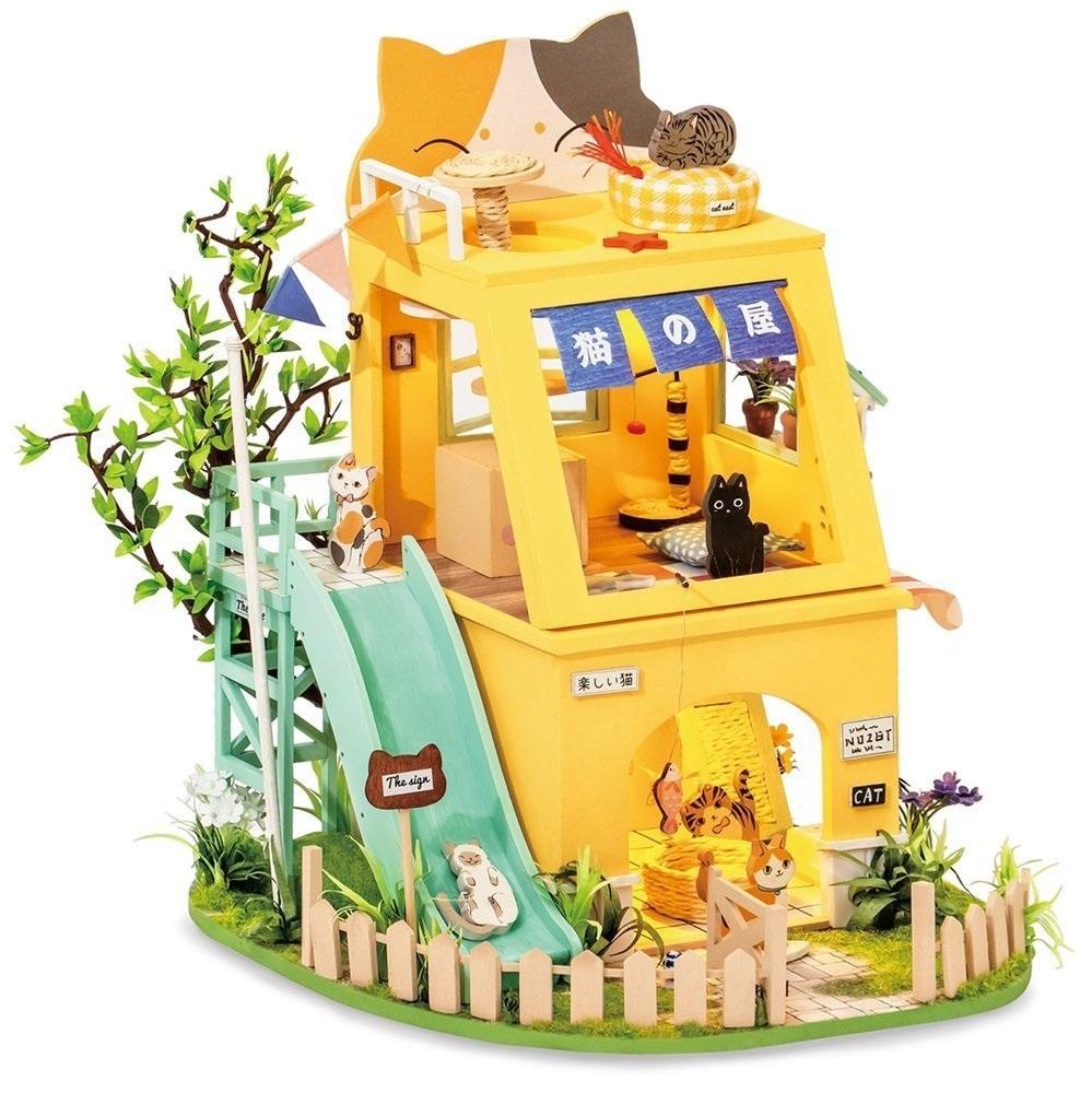 Zestaw umożliwiający złożenie miniaturowego domku dla kotów z oświetleniem LED. Do budowy modelu wykorzystano między innymi drewno, papier, tkaniny, drut, tworzywo sztuczne oraz różne elementy dekoracyjne takie jak: kolorowe ozdoby, cekiny, koraliki, sztuczne kwiaty oraz wiele innych materiałów. Dodatkowego uroku nadaje całości oświetlenie LED, dzięki któremu domek może pełnić rolę nastrojowej dekoracji lub lampki nocnej. Opakowanie oprócz czytelnej, obrazkowej instrukcji zawiera także baterie, pędzelek, farby akrylowe, przezroczysty, bezwonny klej oraz pęsetę ułatwiającą montaż małych elementów. Budowa tego modelu pomoże rozwinąć zdolności manualne i przyniesie dużo satysfakcji.