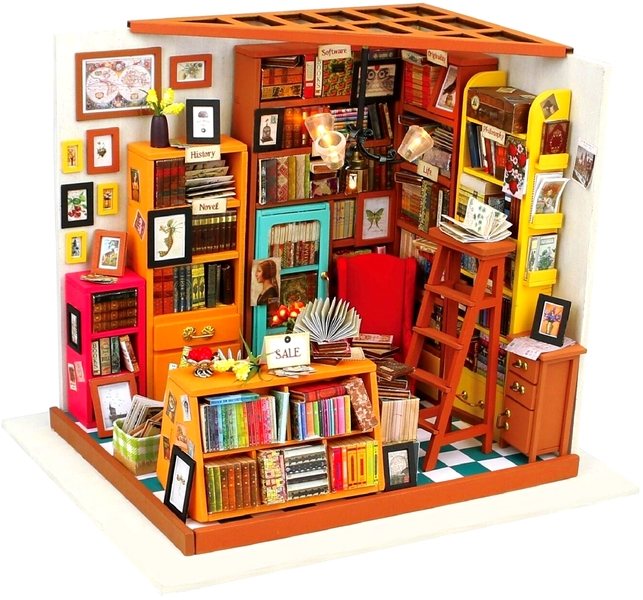Składany Drewniany Model LED – Biblioteka Zestaw umożliwiający złożenie miniaturowej biblioteki z oświetleniem LED. Do budowy modelu wykorzystano między innymi drewno, papier, tkaniny, drut, tworzywo sztuczne oraz różne elementy ozdobne takie jak: kolorowe cekiny, koraliki, sztuczne kwiaty oraz wiele innych materiałów. Dodatkowego uroku nadaje całości oświetlenie LED, dzięki któremu biblioteka może pełnić rolę nastrojowej dekoracji lub lampki nocnej. Opakowanie oprócz czytelnej, obrazkowej instrukcji zawiera także baterie, pędzelek, farby akrylowe, przezroczysty, bezwonny klej oraz pęsetę ułatwiającą montaż małych elementów. Budowa tego modelu pomoże rozwinąć zdolności manualne i przyniesie dużo satysfakcji.