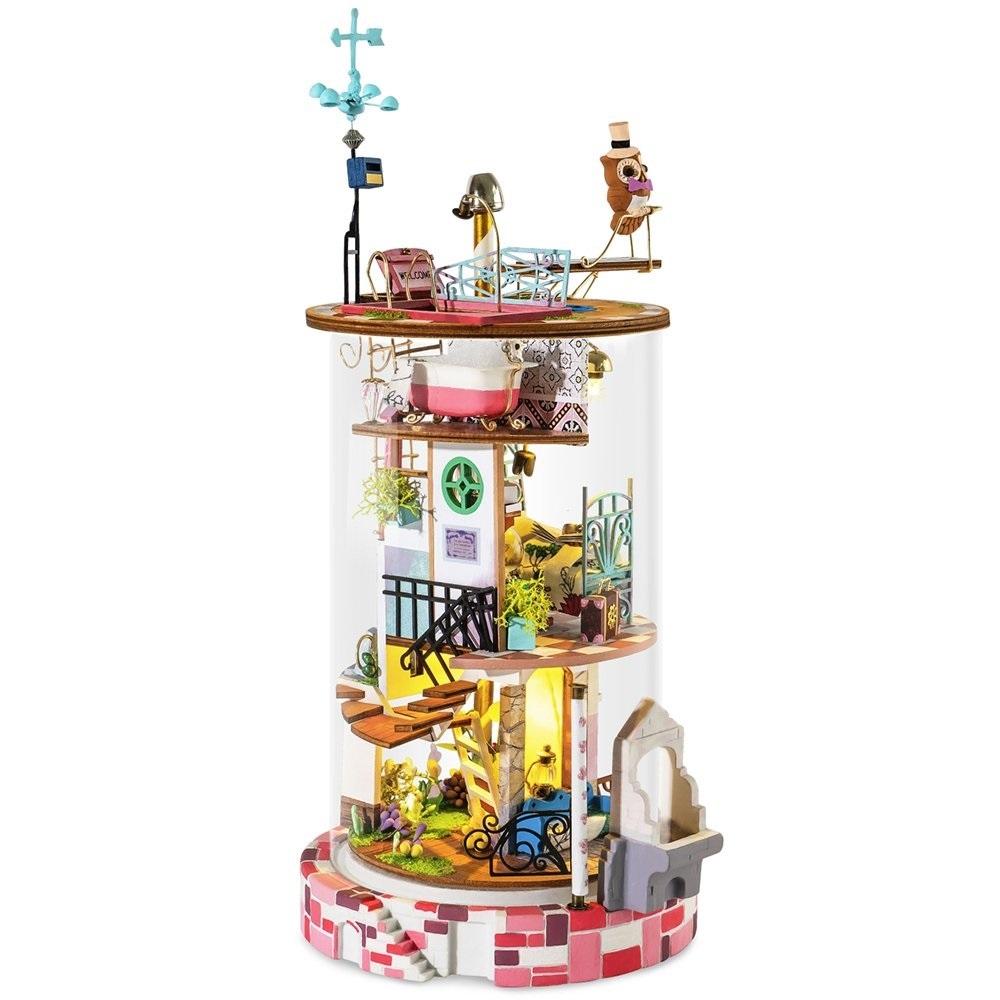 Zestaw umożliwiający złożenie miniaturowego domku z oświetleniem LED, który w celu ochrony przed kurzem i zabrudzeniami, umieszczono w przezroczystej tubie wykonanej z akrylowego szkła. Do budowy modelu wykorzystano między innymi drewno, papier, tkaniny, drut, tworzywo sztuczne oraz różne elementy dekoracyjne takie jak: kolorowe ozdoby, cekiny, koraliki, sztuczne kwiaty oraz wiele innych materiałów. Dodatkowego uroku nadaje całości oświetlenie LED, dzięki któremu domek może pełnić rolę nastrojowej dekoracji lub lampki nocnej. Opakowanie oprócz czytelnej, obrazkowej instrukcji zawiera także baterie, pędzelek, farby akrylowe, przezroczysty, bezwonny klej oraz pęsetę ułatwiającą montaż małych elementów. Budowa tego modelu pomoże rozwinąć zdolności manualne i przyniesie dużo satysfakcji.