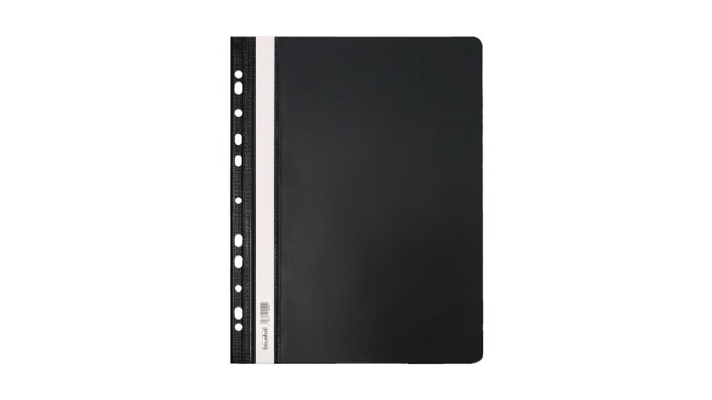 folia PVC, przód twardy przezroczysty, tył twardy kolorowy, boczna perforacja umożliwiająca wpięcie do segregatora z dowolnym ringiem, w środku blaszka i wąs o długości 16,5 cm, umożliwiający wpięcie dokumentów do 2 cm, wymienny, papierowy pasek do opisu, dwa wycięcia ułatwiające wysuwanie paska, w formacie A4 zaokrąglone rogi obu okładek, format A4 i A5, występuje w 9 kolorach
