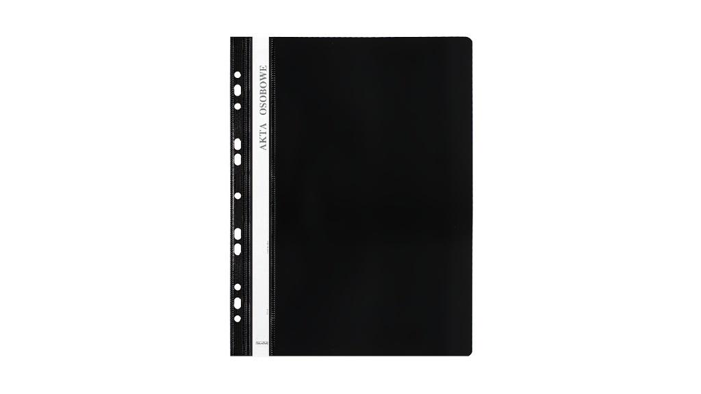Skoroszyt wykonany z twardej, nieprzezroczystej folii PVC, dla ochrony danych osobowych. Wewnątrz zamontowano mechanizmy skoroszytowe umożliwiające wpięcie dokumentów. Wyposażony w uniwersalne, papierowe przekładki A, B, C, D, E bez opisu kategorii. Wzmocniona boczna perforacja umożliwiająca wpięcie do segregatora z dowolnym ringiem. Na przedniej stronie podłużna kieszeń z wymiennym, papierowym paskiem do opisu zawartości. Po obu stronach kieszeni dwa wycięcia ułatwiające wysuwanie paska.
