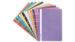 Skoroszyt wykonany z polipropylenu, miękki, przód przezroczysty, tył kolorowy. Europerforacja umożliwiająca wpięcie do segregatora z dowolnym ringiem. Wewnątrz klasyczny mechanizm z wąsem i listwą skutecznie zabezpieczający wpiętą zawartość; wąs o długości 14,5 cm. Na bocznej krawędzi wymienny, papierowy pasek do opisu zawartości z kodem kreskowym na szt. Dwa wycięcia ułatwiające wysuwanie paska. Zaokrąglone rogi obu okładek.