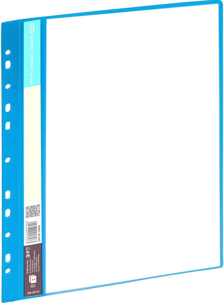 Grzbiet z europerforacją, wewnętrzne przezroczyste kieszenie A4, 10 kieszeni, przednia okładka