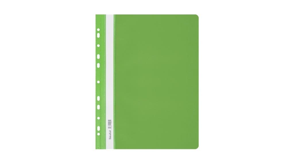 Skoroszyt wykonany z twardej folii PVC, przód przezroczysty, tył kolorowy. Europerforacja umożliwiająca wpięcie do segregatora z dowolnym ringiem. Wewnątrz klasyczny mechanizm z wąsem i listwą skutecznie zabezpieczający wpiętą zawartość; wąs o długości 16,5 cm. Na bocznej krawędzi wymienny, papierowy pasek do opisu zawartości z kodem kreskowym na szt. Dwa wycięcia ułatwiające wysuwanie paska. Zaokrąglone rogi obu okładek.