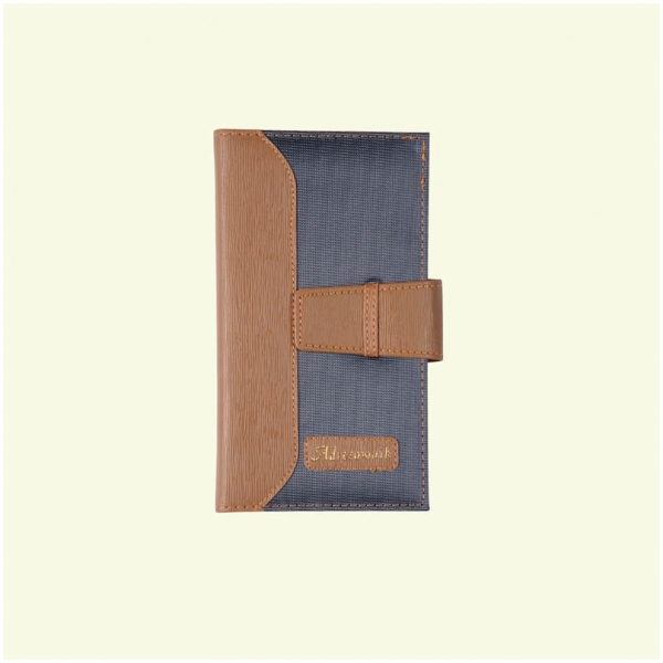 Skorowidz książkowy z kolekcji standard 3B. Okładka to połączenie podwójnie tkanego niebieskiego nylonu oraz tworzywa, zamykana na pasek. Wykończona wewnątrz beżowym tworzywem. Wkład adresownika z papieru chamois 80g/m2, kartki w linie, szyte i klejone, w sztywnej okładce.Wymiar: 10,5x18,8 cm.