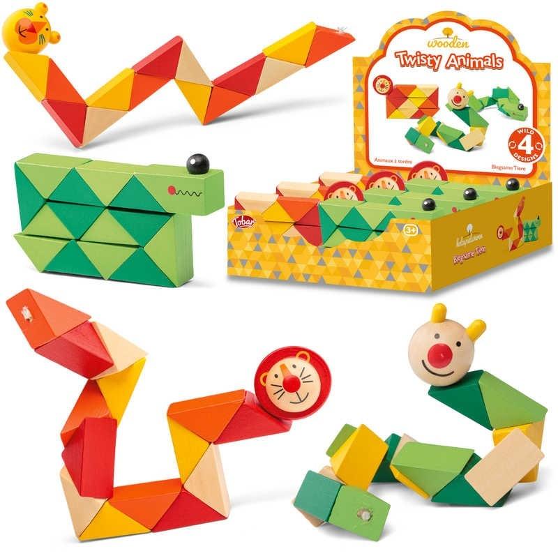 Drewniane klocki, które zostały połączone w jedno podłużne zwierzę. Zabawka dostępna jest w 3 wersjach, różnią się rodzajem zwierzaka. Mamy tutaj do wyboru lwa, gąsienice oraz węża. W zależności od rodzaju zwierzaka klocki są w innym kolorze. Dzięki temu każda zabawka jest charakterystyczna wyglądem dla danej postaci. Klocki są połączone ze sobą w specjalny sposób. Co daje możliwość dowolnego obracania nimi i skręcania. Sprawia to, że zwierzaki z drewna to idealna zabawka do krytycznych zabaw. Na końcu każdej zabawki znajduje się głowa zwierzaka. Całkowita długość zabawki to 21,5cm.