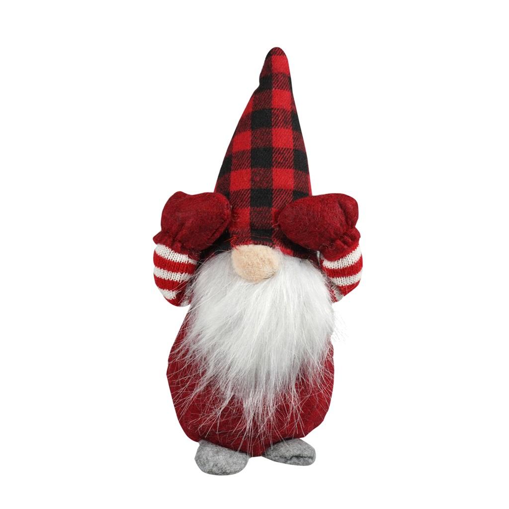 Dekoracja zimowa w kształcie nieśmiałego skrzata. Wykonany z miękkiego filcu i materiału. Dół dekoracji został obciążony, aby umożliwić stabilne postawienie ozdoby. To uroczy świąteczny skrzat w kolorze czerwonym w kraciastej czapce z puchatą brodą. Idealna ozdoba do domu lub pomysł na upominek. Skrzat o wysokości 21 cm.