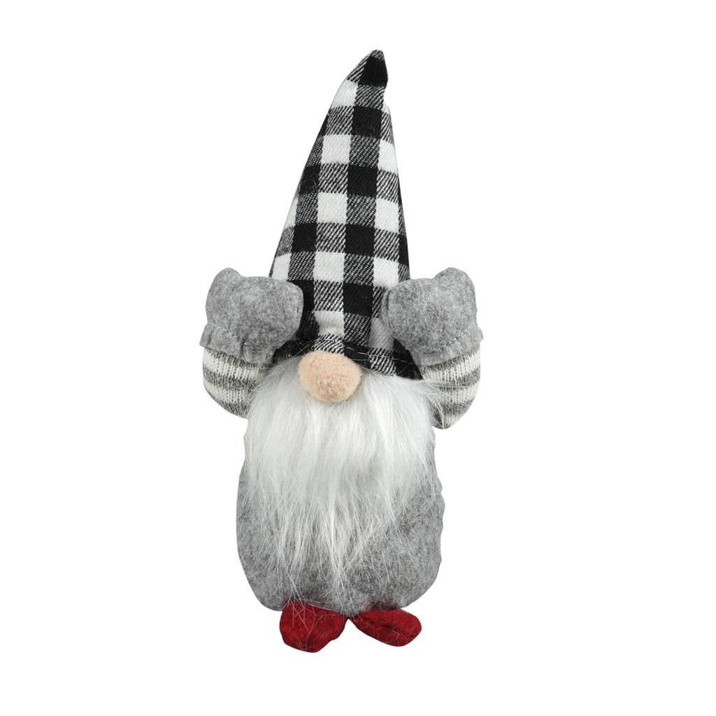 Dekoracja zimowa w kształcie nieśmiałego skrzata. Wykonany z miękkiego filcu i materiału. Dół dekoracji został obciążony, aby umożliwić stabilne postawienie ozdoby. To uroczy świąteczny skrzat w kolorze szarym w kraciastej czapce z puchatą brodą. Idealna ozdoba do domu lub pomysł na upominek. Skrzat o wysokości 21 cm.