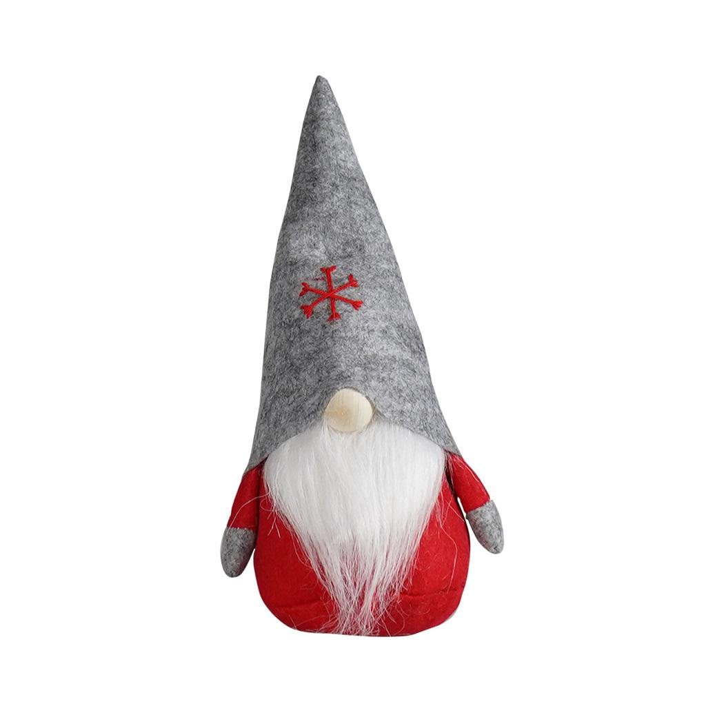 Czerwony skrzat dekoracyjny z dużą szarą czapą i białą puchatą brodą. Na szarej czapce znajduje się wyszywany czerwoną nicią płatek śniegu. Ozdoba wykonana z filcu. Nos skrzata wykonano z drewna. Dekoracja stojąca, dół ozdoby został obciążony, aby umożliwić stabilne jej postawienie. Wysokość skrzata: 25 cm.