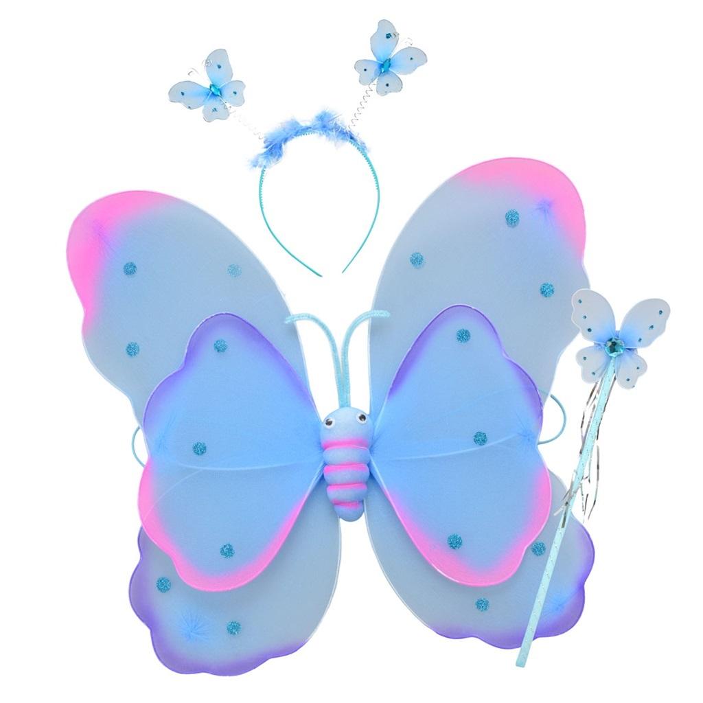 Komplet zawiera opaskę z motylkami, różdżkę i skrzydełka mocowane na gumce. Rozmiar skrzydełek: 52 x 40 cm Kolor: niebieski