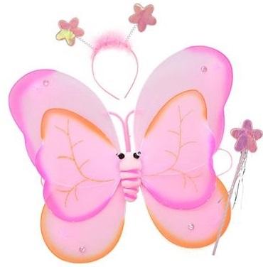 Komplet zawiera opaskę z motylkami, różdżkę i skrzydełka mocowane na gumce. Rozmiar skrzydełek: 52 x 40 cm Kolor: różowy