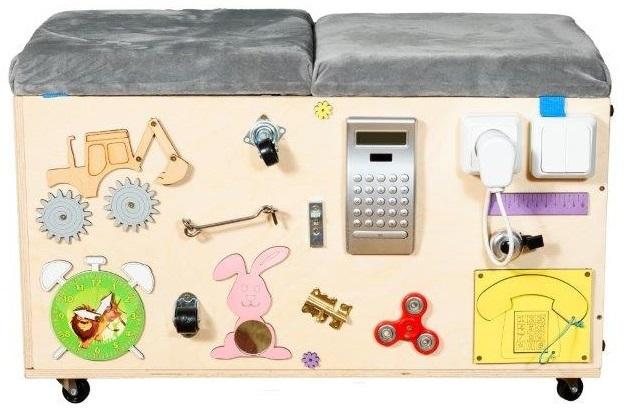 Pufa wyposażona w skrętne kółka. Podnoszone siedzisko z miękką gąbką, obite polarem. Pojemnik podzielony na dwie części