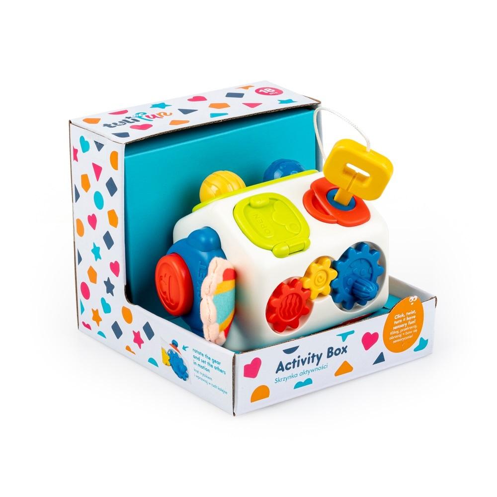Podręczna skrzyneczka, wypełniona po brzegi zadaniami, aktywizującymi rączki malucha! Każda ze stron to inna, zręcznościowa zabawa. Jest tu włącznik do przesuwania, przycisk do klikania, wiatraczek, którym można kręcić za pomocą paluszka, trybiki i kluczyk do przekręcania, kuleczka do przesuwania i dwie kuleczki pop it do wciskania. Rączka skrzynki jest wysuwana, więc stanowi zarazem praktyczny uchwyt, ułatwiający przenoszenie zabawki.