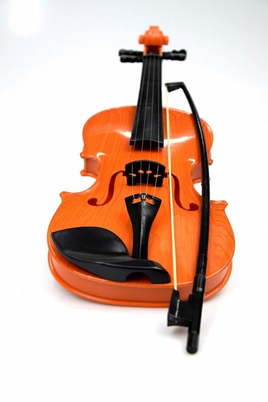Skrzypce wyglądem przypominają prawdziwy instrument. Przy umiejętnym pociąganiu smyczkiem wydają dźwięk zbliżony do prawdziwego - mają podbródek, smyczek ze sztucznego włosia i wyglądają bardzo realistycznie. Można je ""stroić"". Długość skrzypiec ok. 45cm, zabawka plastikowa.