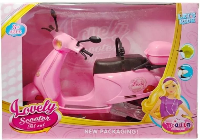 Różowy skuter dla lalki z realistycznymi detalami. Zapakowany w kartonowe pudełko. Zabawka przeznaczona dla dzieci od lat 3.