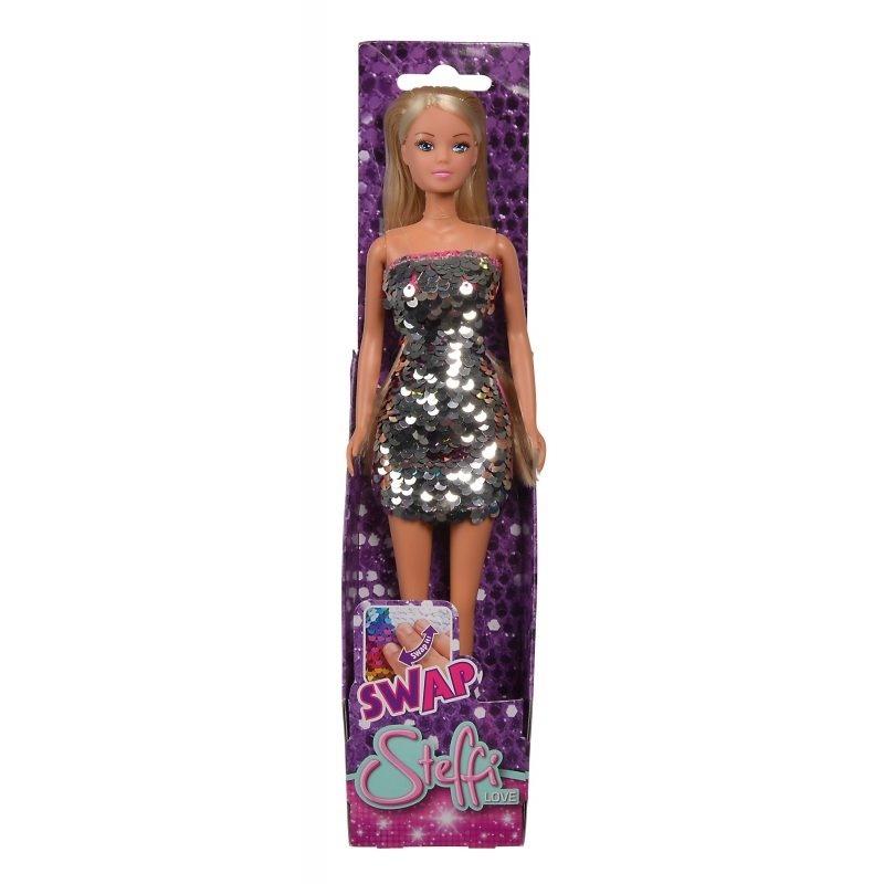Lalka Steffi Love w sukience cekinowej, która zmienia kolor po przewróceniu cekinów, dostępna w sukienkach w 4 wariantach kolorystycznych: fioletowa zmieniająca się w srebrną i odwrotnie, niebieska zmieniająca się w złotą i odwrotnie, różowa zmieniająca się w niebieską i odwrotnie, srebrna zmieniająca się w kolorową i odwrotnie (sprzedawane oddzielnie, w zależności od dostępności).