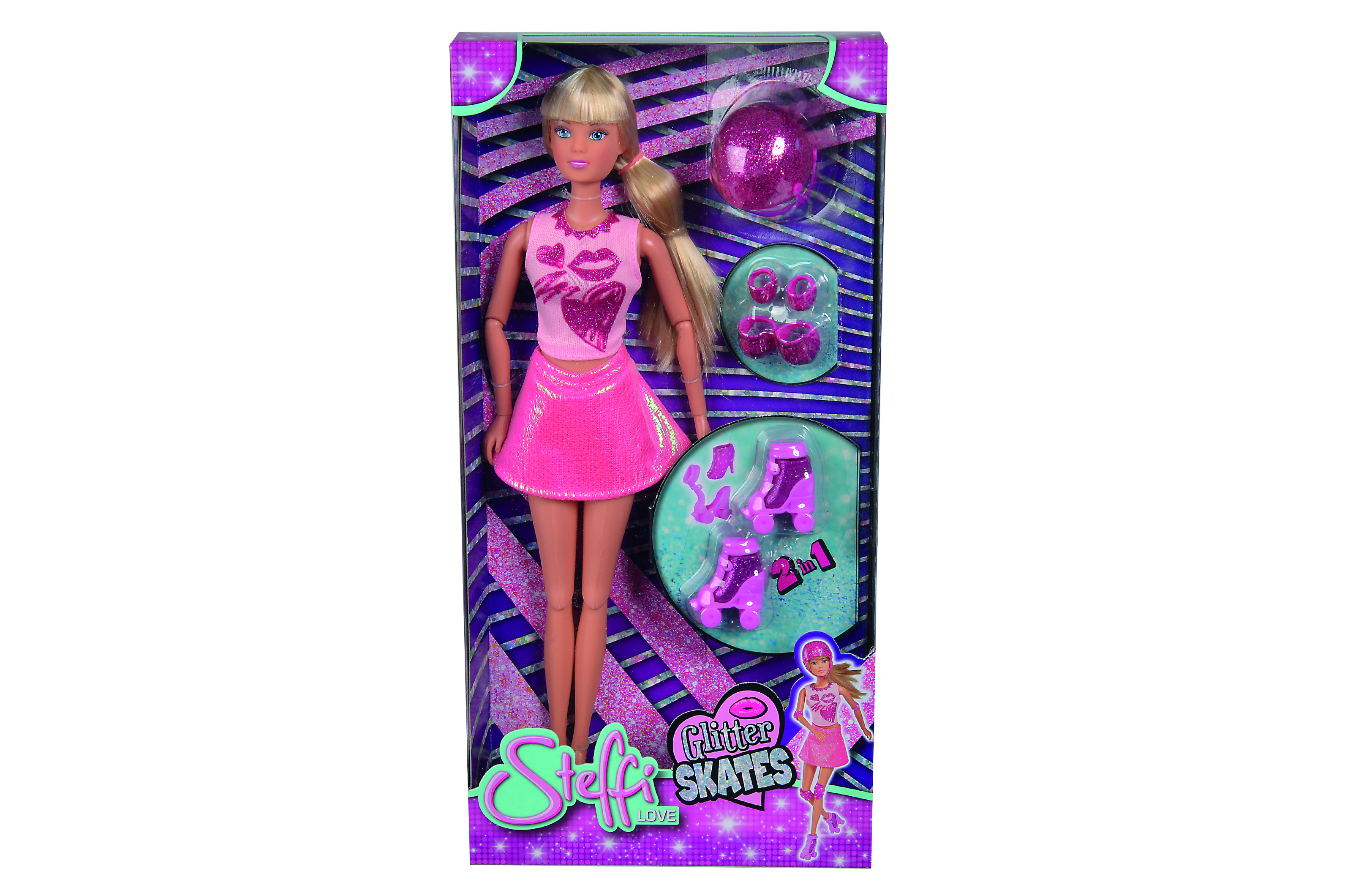 Steffi na wrotkach z ochraniaczami i błyszczącym kaskiem. Ma zginane w kolanach nogi i w łokciach ręce. Wrotki 2w1 - mają wmontowane buty na wysokim obcasie, które pasują do sukienki z błyszczącymi akcentami.