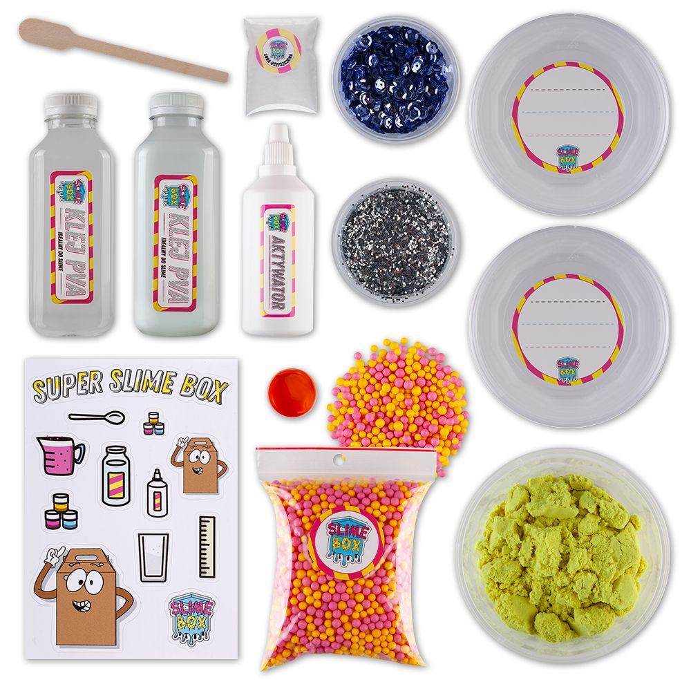 W zestawie znajdują się wszystkie niezbędne produktydo samodzielnego przygotowania pięciu slime. Do każdego Super Slime Box dołączamy dodatki, które są niespodzianką,ale umożliwiają za każdym razem zabawę w nowe kolory,formy czy struktury utworzonej masy.