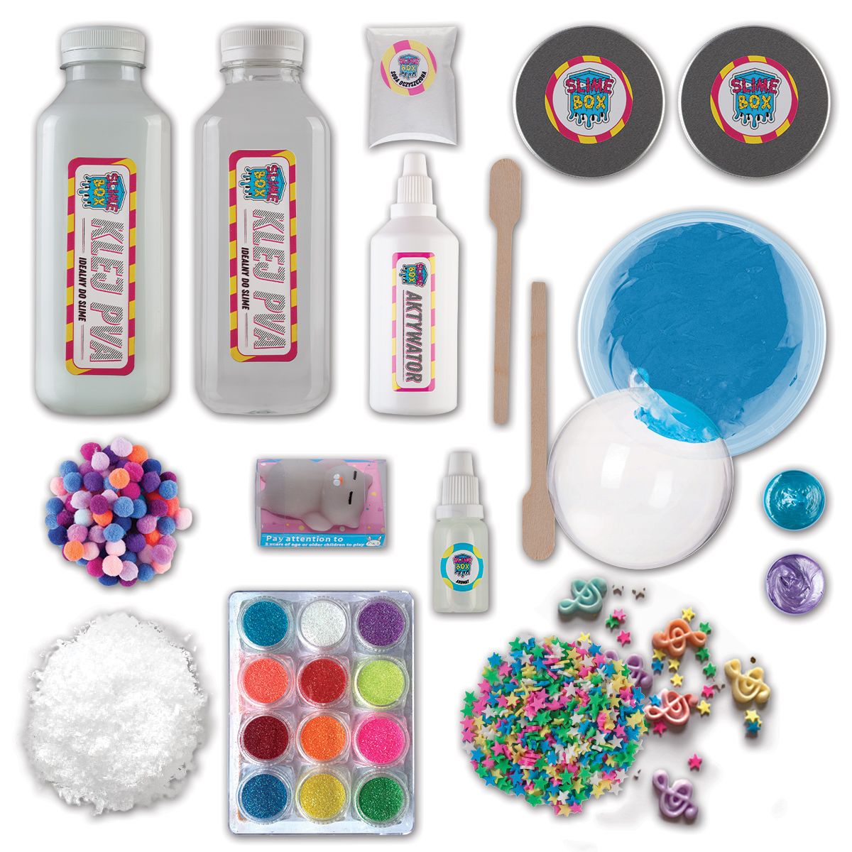 Winter Slime Box to moc kreatywnej zabawy DIY. Z produktów można wykonać aż 8-10 slime, dwie bombki według własnego projektu, a nawet eksperyment ze sztucznym śniegiem. Rozwijaj kreatywność i sensorykę podczas zabawy kreatywnymi zabawkami Slimebox.