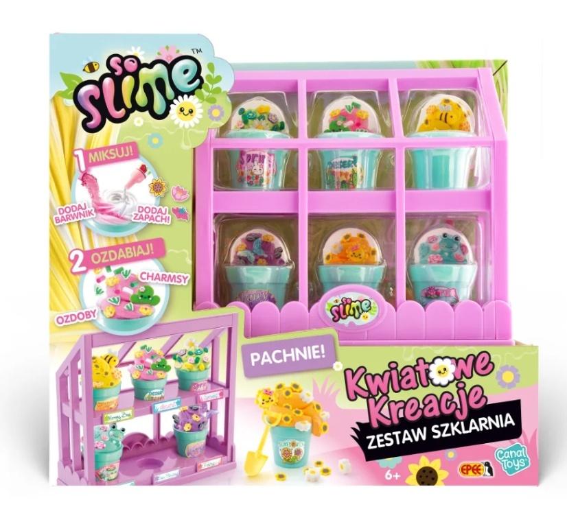 Pozwalają na tworzenie wyjątkowych kompozycji kwiatowych ze slajmu, który można zabarwić jednym z 6 kolorów. To Twój własny kwiatowy ogród w zasięgu ręki! Zestaw Szklarnia umożliwia stworzenie 6 uroczych doniczek z kwiatowymi ozdobami, które umieszczone są w pięknej, przejrzystej szklarni. Dzięki temu Twój miniaturowy ogród zawsze wygląda bajecznie. Każdy slime może mieć inny kolor i zapach, a dodając do niego błyszczące cekiny, brokat, zabawne zawieszki i ozdoby, stworzysz prawdziwy kwiatowy świat w miniaturze.
