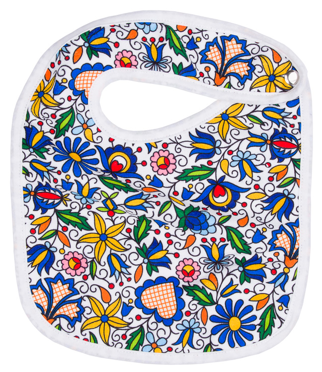 Śliniak z wzorem w kwiaty z haftów kaszubskich : projekt inspirowany tradycyjnymi wzorami ludowymi z haftów kaszubskich,motywem przewodnim wśród kaszubskich wzorów kwiatowych są: goździki, bratki, koniczynki, chabry, niezapominajki, dzwonki, lilie i róże,materiał: 100% bawełna,kolorowy nadruk na jednej stronie, spód biały,zapinany na nap,miękki w dotyku,praktyczny - skutecznie ochroni ubranie malucha przed zabrudzeniami,niezbędny element wyprawki niemowlęcej