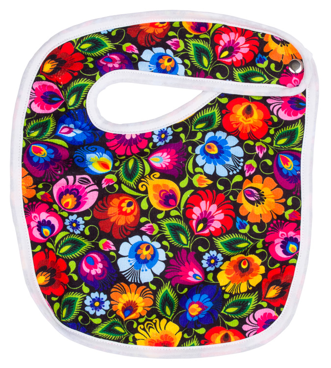 Śliniak z wzorem w łowickie kwiaty z wycinanki: projekt inspirowany tradycyjnymi wzorami ludowymi z wycinanek łowickich,podstawowymi elementami wycinanek łowickich są koguty, pawie oraz motywy kwiatowe,materiał: 100% bawełna,kolorowy nadruk na jednej stronie, spód biały,zapinany na nap,miękki w dotyku,praktyczny - skutecznie ochroni ubranie malucha przed zabrudzeniami,niezbędny element wyprawki niemowlęcej