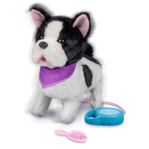 Piesek przypominający francuskiego buldoga. Zabawki wykonane zostały z bardzo przyjemnego w dotyku materiału, przez co idealnie nadają się do przytulania. Do zestawu dołączona jest również smycz oraz mała szczotka do czesania zwierzaka. Piesek potrafi samodzielnie chodzić i dzięki smyczy można go wyprowadzać na spacery. Zabawka wydaje z siebie również dźwięki przypominające prawdziwego psa, reagując w ten sposób na różne gesty. Wykonana z wysokiej jakości materiałów jest bardzo bezpieczna. Zabawki do swojego działania wymagają baterii.