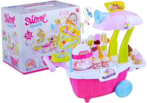 Słodki sklep z wieloma akcesoriami Zestaw Sweet Shop to przesłodka zabawka dla wszystkich dziewczynek kochających wszelkie desery i lody. Komplet składający się z wózeczka ozdobionego daszkiem i megafonem, a także wielu plastikowych przysmaków, pozwoli dziecku na długą i wesołą zabawę. Możliwość wcielenia się w sprzedawcę łakoci z pewnością zachwyci każdego malucha. Kolorowe stoisko posiada kółka i rączkę, co znacznie ułatwia przemieszczanie się dziecka z małym sklepikiem. Pokrywa wózka jest ściągana, dzięki czemu właścicielka kramiku ze słodyczami może przechowywać w nim swój wielokolorowy asortyment. Dużą zaletą stoiska z deserami są interaktywne funkcje. By uruchomić światełko w maszynce do robienia popcornu, a także wesołe dźwięki płynące z megafonu, należy zaopatrzyć się w 3 sztuki baterii AA 1,5 V, które nie są dołączone do zestawu. Słodki sklepik wykonany jest z materiałów wysokiej jakości, co gwarantuje jego długą żywotność, a także bezpieczeństwo płynące z korzystania. Zabawka ta przeznaczona jest dla dziewczynek, które ukończyły 3. rok życia. Na pakiet słodkiego sklepu składa się wiele słodkich części, między innymi: - wózeczek na kółkach z rączką, - monety, - megafon, - popcorn wraz z pojemniczkami, - lizaki, - lody na patykach, - lody w rożkach, - maszynka do popcornu, - stojak na lody, - ozdoby z motywem lodów. Wymiary kolorowej zabawki: - 19,5 cm x 36 cm x 38,5 cm Wymiary opakowania: - 28 cm x 24 cm x 21 cm