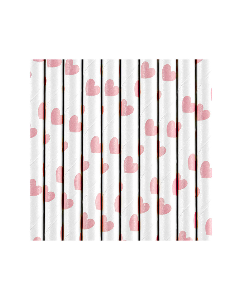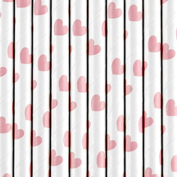 Słomki papierowe w kolorze białym z jasnoróżowymi sercami, długość około 19,5 centymetra.(1 op. / 10 szt.)