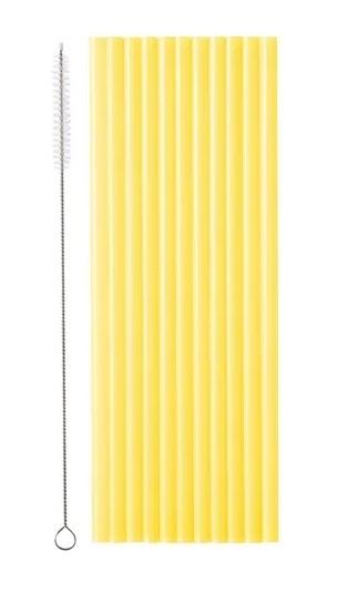 Słomki plastikowe w kolorze żółtym, średnica ok. 7 mm, długość ok. 23 cm. Zestaw zawiera czyścik. Produkt wielokrotnego użytku.(1 op. / 12 szt.)