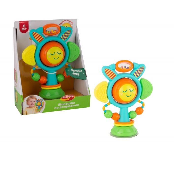 Wesołe słoneczko, które pomimo niewielkich rozmiarów łączy w sobie mnóstwo niespodzianek dla najmłodszych. Znajdziemy tu obrotowe elementy o zróżnicowanej fakturze, grzechotkę z kolorowymi kuleczkami, ruchome koraliki, a także praktyczną przyssawkę, za pomocą której bez kłopotu przyczepisz słoneczko do dowolnej płaskiej powierzchni. Naciśnij na buzię słoneczka, a zaświeci się ona na różne kolory. Zabawka przeznaczona dla dzieci od dnia narodzin.