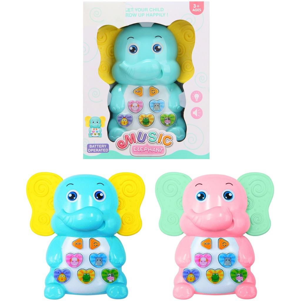 Muzyczna zabawka słonik posiada na brzuchu kilka przycisków odgłosami zwierzątek oraz melodyjkami.
