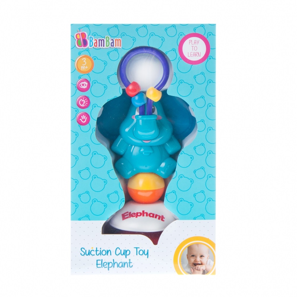Grzechotka Słonik na Przyssawkę Bam Bam to zabawka edukacyjna z możliwością przytwierdzenia do stolika, tacki od wózka czy stolika do karmienia.
