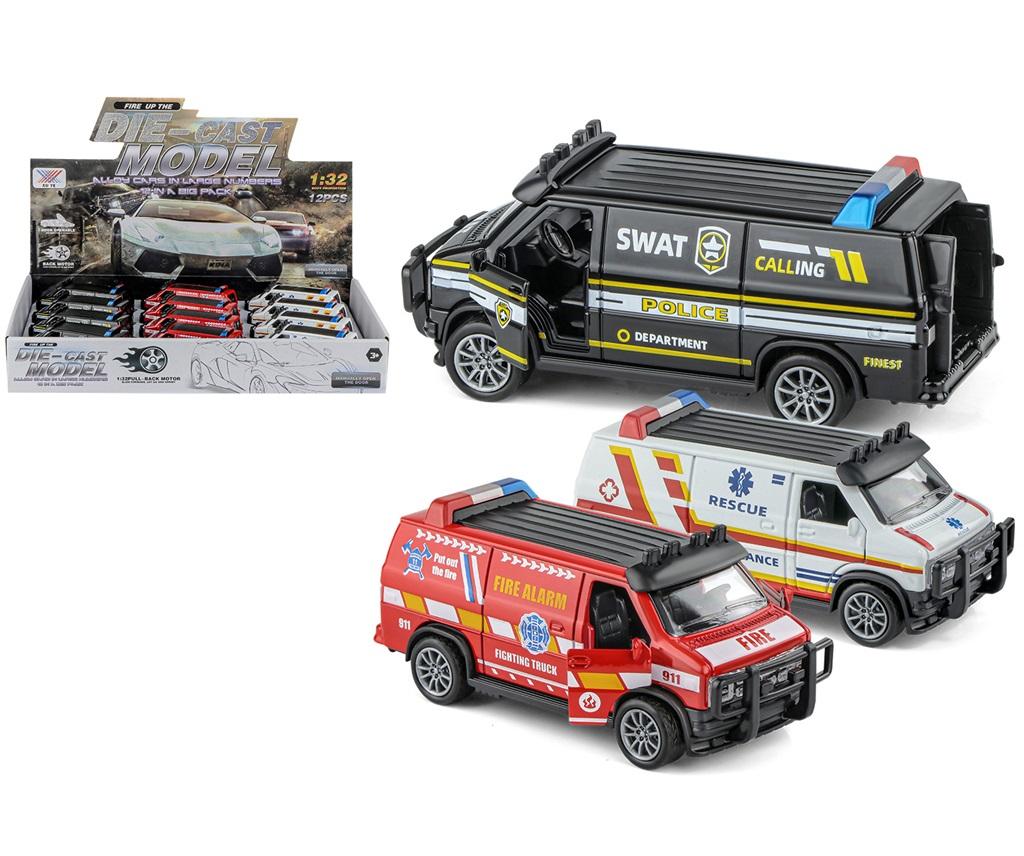 Metalowy model auta służb ratowniczych z otwieranymi drzwiami.