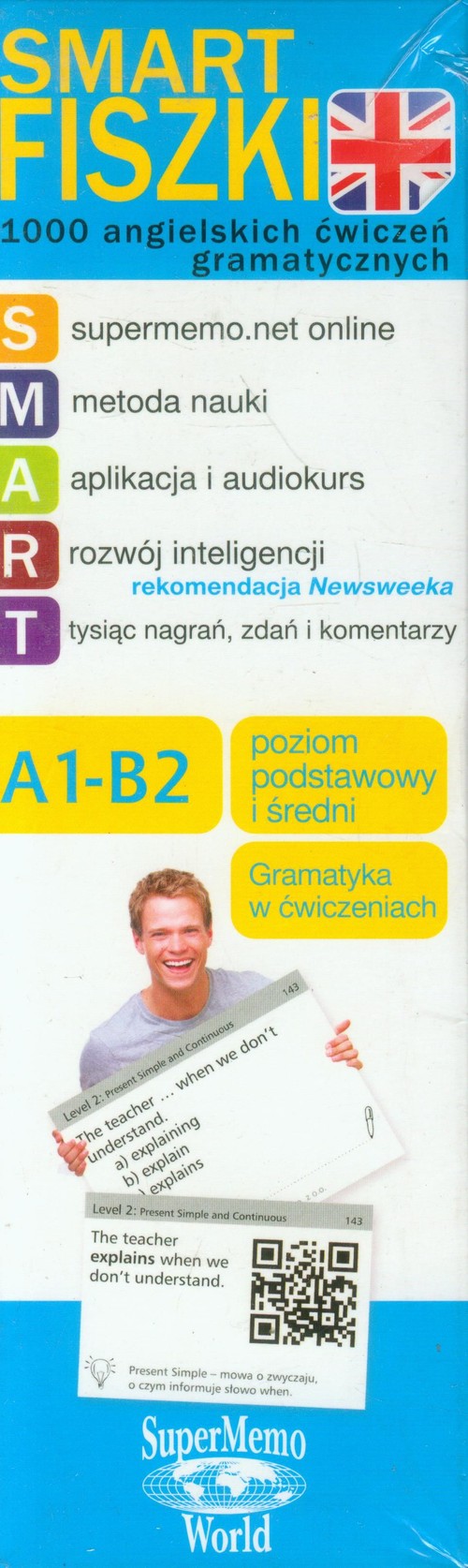 Karteczki do samodzielnych ćwiczeń gramatycznych z języka angielskiego na poziomie podstawowym i średnim (A1 – B2), z darmowym kursem online, audiokursem i aplikacją czytającą kody obrazkowe. SMARTfiszki umożliwiają wykonywanie ćwiczeń gramatycznych na wiele sposobów. Można przeglądać i powtarzać porcję fiszek w autobusie lub pociągu, jednocześnie słuchając audiokursu z nagraniami ich zawartości. Proponujemy też darmowy dostęp do serwisu szybkiej nauki supermemo.net, w którym proces nauki wspiera wielokrotnie nagradzana i poparta badaniami naukowymi metoda SuperMemo. Fiszki prezentują poziomy A1 – B2 według skali Rady Europy. Zawartość pakietu: • 1000 fiszek do samodzielnej nauki • Nagrania wszystkich ćwiczeń do odsłuchania bezpośrednio z fiszki przy pomocy iPhone’a lub smartfonów z systemem Android, do pobrania ze strony www.smartfiszki.pl • Kod umożliwiający naukę gramatyki angielskiej online w serwisie supermemo.net przez 6 miesięcy gratis • Audiokurs w formie plików MP3 do nauki ze słuchu, do pobrania ze strony www.smartfiszki.pl • Praktyczne przekładki oraz kalendarz powtórek wraz z instrukcją Fiszki w pudełku W pudełku znajduje się 1000 fiszek, 41 przekładek oraz przewodnik. Fiszki ułożone są poziomami trudności od 1 do 10 i ponumerowane od 1 do 1000. Każdy poziom obejmuje kilka wybranych zagadnień gramatycznych (np. Prepositions, Conditionals, Conjunctions, Adjectives and adverbs, Question Tags, Different tenses). Każdy poziom oraz zagadnienie są umieszczone na górnym pasku każdej fiszki. Na froncie fiszki znajdują się: ćwiczenie testowe (wybór jednej opcji spośród podanych), oznaczenie rozdziału, numer kolejny fiszki oraz miejsce na dopisanie własnych notatek. Z tyłu fiszki można znaleźć: zdanie uzupełnione prawidłową opcją, krótki komentarz gramatyczny uzasadniający wybór danej opcji oraz kod obrazkowy. Audiokurs Oferuje możliwość nauki ze słuchu angielskich zdań z ćwiczeń na fiszkach. Zawiera prawie 2 godziny nagrań w formacie MP3. Nagrania są wykonane przez profesjonalnych lektorów. Aplikacja na iPhone’a i smartfony Aplikacja na iPhone’a i smartfony z systemem Android umożliwia odsłuchanie nagrań na podstawie zeskanowanych kodów z fiszek. Szczegóły i darmowa aplikacja są do pobrania na stronie www.smartfiszki.pl. Kurs online Pakiet zawiera kod umożliwiający bezpłatną naukę przez 6 miesięcy w serwisie szybkiej nauki online na stronie www.supermemo.net, z możliwością przedłużenia. Oferujemy możliwość nauki z kursu „English Grammar”, który zawiera treść fiszek. Nauka w kursie z metodą SuperMemo pozwala trwale zapamiętać treść kursu w zaskakująco krótkim czasie. Wymagania sprzętowe: • Dla aplikacji „Czytnik kodów” – iPhone/iPod z kamerą (iOS4 lub nowszy) lub smartfon z Androidem w wersji 2.1-2.3 posiadający kamerę z opcją autofokus. Plik do pobrania ma rozmiar 79 MB. • Dla audiokursu – dowolny odtwarzacz MP3. Należy pobrać plik o rozmiarze 50 MB.