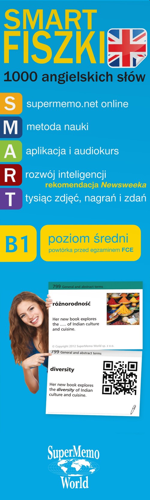 Karteczki do samodzielnej nauki słówek angielskich na poziomie średnim FCE (B1), z darmowym kursem online, audiokursem i aplikacją czytającą kody obrazkowe. SMARTfiszki umożliwiają naukę słówek na wiele sposobów. Można przeglądać i powtarzać porcję fiszek w autobusie lub pociągu, jednocześnie słuchając audiokursu z nagraniami ich zawartości. Proponujemy też darmowy dostęp do serwisu szybkiej nauki supermemo.net, w którym proces nauki wspiera wielokrotnie nagradzana i poparta badaniami naukowymi metoda SuperMemo. Fiszki prezentują poziom B1 według skali Rady Europy. Zawartość pakietu: • 1000 kolorowych fiszek ze zdjęciami • Nagrania wszystkich słówek i zdań przykładowych do odsłuchania bezpośrednio z fiszki przy pomocy iPhone’a lub smartfonów z systemem Android, do pobrania ze strony www.smartfiszki.pl • Kod umożliwiający naukę słownictwa z fiszek online w serwisie supermemo.net przez 6 miesięcy gratis • Audiokurs w formie plików MP3 do nauki ze słuchu, do pobrania ze strony www.smartfiszki.pl • Praktyczne przekładki oraz kalendarz powtórek wraz z instrukcją Fiszki w pudełku W pudełku znajduje się 1000 fiszek, 41 przekładek oraz przewodnik. Fiszki ułożone są w 13 rozdziałach tematycznych: Ciało, życie, istoty żywe i natura, Ludzie, rodzina, społeczeństwo, Budowle, dom, odzież i higiena osobista, Emocje, postawy i odczucia, Myśl, komunikacja i język, Substancje, przedmioty, sprzęt i jedzenie, Sztuka, przemysł, edukacja i technologia, Miary, pieniądze i handel, Rozrywka, gry i sport, Wygląd, czas i przestrzeń, Ruch, położenie, podróżowanie i transport, Pojęcia ogólne i abstrakcyjne, Podstawy. Każdy rozdział oznaczony jest innym kolorem paska górnego. Wewnątrz rozdziałów fiszki są ułożone frekwencyjnie, zaczynając od najczęściej używanych w języku. Na froncie fiszki znajdują się: słówko polskie, zdjęcie, zdanie z luką oraz oznaczenie rozdziału i numer kolejny fiszki. Z tyłu fiszki można znaleźć: słówko angielskie, pełne zdanie i kod obrazkowy oraz miejsce na dopisanie własnych notatek. Audiokurs Oferuje możliwość nauki ze słuchu słówek angielskich z polskimi tłumaczeniami. Zawiera ponad 4 godziny nagrań w formacie MP3 w układzie aktywnym (z polskiego na angielski) i pasywnym (z angielskiego na polski). Nagrania są wykonane przez profesjonalnych lektorów brytyjskich i polskich. Aplikacja na iPhone’a i smartfony Aplikacja na iPhone’a i smartfony z systemem Android umożliwia odsłuchanie nagrań na podstawie zeskanowanych kodów z fiszek. Szczegóły i darmowa aplikacja są do pobrania na stronie www.smartfiszki.pl. Kurs online Pakiet zawiera kod umożliwiający bezpłatną naukę przez 6 miesięcy w serwisie szybkiej nauki online na stronie www.supermemo.net, z możliwością przedłużenia. Oferujemy możliwość nauki z kursu „Extreme English Multi”, który zawiera treść fiszek. Nauka w kursie z metodą SuperMemo pozwala trwale zapamiętać treść kursu w zaskakująco krótkim czasie. Wymagania sprzętowe: • Dla aplikacji „Czytnik kodów” – iPhone/iPod z kamerą (iOS4 lub nowszy) lub smartfon z Androidem w wersji 2.1-2.3 posiadający kamerę z opcją autofokus. Plik do pobrania ma rozmiar 130 MB. • Dla audiokursu – dowolny odtwarzacz MP3. Należy pobrać 2 pliki po 122 MB każdy.