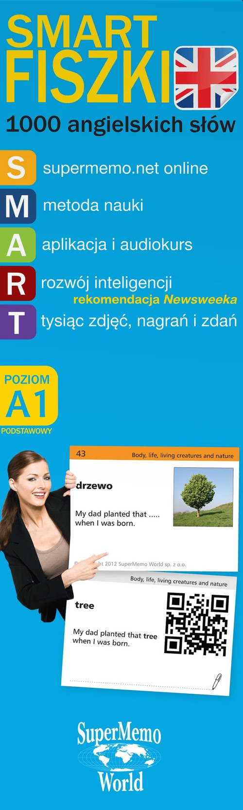Karteczki do samodzielnej nauki podstawowych słówek angielskich, z darmowym kursem online, audiokursem i aplikacją czytającą kody obrazkowe. SMARTfiszki umożliwiają naukę słówek na wiele sposobów. Można przeglądać i powtarzać porcję fiszek w autobusie lub pociągu, jednocześnie słuchając audiokursu z nagraniami ich zawartości. Proponujemy też darmowy dostęp do serwisu szybkiej nauki supermemo.net, w którym proces nauki wspiera wielokrotnie nagradzana i poparta badaniami naukowymi metoda SuperMemo. Fiszki prezentują poziom A1 według skali Rady Europy. Zawartość pakietu: •1000 kolorowych fiszek ze zdjęciami •Nagrania wszystkich słówek i zdań przykładowych do odsłuchania bezpośrednio z fiszki przy pomocy iPhone’a lub smartfonów z systemem Android, do pobrania ze strony www.smartfiszki.pl •Kod umożliwiający naukę słownictwa z fiszek online w serwisie supermemo.net przez 6 miesięcy gratis •Audiokurs w formie plików MP3 do nauki ze słuchu, do pobrania ze strony www.smartfiszki.pl •Praktyczne przekładki oraz kalendarz powtórek wraz z instrukcją Fiszki w pudełku W pudełku znajduje się 1000 fiszek, 41 przekładek oraz przewodnik. Fiszki ułożone są ułożone są w 13 rozdziałach tematycznych: Ciało, życie, istoty żywe i natura, Ludzie, rodzina, społeczeństwo, Budowle, dom, odzież i higiena osobista, Emocje, postawy i odczucia, Myśl, komunikacja i język, Substancje, przedmioty, sprzęt i jedzenie, Sztuka, przemysł, edukacja i technologia, Miary, pieniądze i handel, Rozrywka, gry i sport, Wygląd, czas i przestrzeń, Ruch, położenie, podróżowanie i transport, Pojęcia ogólne i abstrakcyjne, Podstawy. Każdy rozdział oznaczony jest innym kolorem paska górnego. Wewnątrz rozdziałów fiszki są ułożone frekwencyjnie, zaczynając od najczęściej używanych w języku. Na froncie fiszki znajdują się: słówko polskie, zdjęcie, zdanie z luką oraz oznaczenie rozdziału i numer kolejny fiszki. Z tyłu fiszki można znaleźć: słówko angielskie, pełne zdanie i kod obrazkowy oraz miejsce na dopisanie własnych notatek. Audiokurs Oferuje możliwość nauki ze słuchu słówek angielskich z polskimi tłumaczeniami. Zawiera prawie 4 godziny nagrań w formacie MP3 w układzie aktywnym (z polskiego na angielski) i pasywnym (z angielskiego na polski). Nagrania są wykonane przez profesjonalnych lektorów brytyjskich i polskich. Aplikacja na iPhone’a i smartfony Aplikacja na iPhone’a i smartfony z systemem Android umożliwia odsłuchanie nagrań na podstawie zeskanowanych kodów z fiszek. Szczegóły i darmowa aplikacja są do pobrania na stronie www.smartfiszki.pl. Kurs online Pakiet zawiera kod umożliwiający bezpłatną naukę przez 6 miesięcy w serwisie szybkiej nauki online na stronie www.supermemo.net, z możliwością przedłużenia. Oferujemy możliwość nauki z kursu „Extreme English 1: Basic”, który zawiera treść fiszek. Nauka w kursie z metodą SuperMemo pozwala trwale zapamiętać treść kursu w zaskakująco krótkim czasie. Wymagania sprzętowe: •Dla aplikacji „Czytnik kodów” – iPhone/iPod z kamerą (iOS4 lub nowszy) lub smartfon z Androidem w wersji 2.1-2.3 posiadający kamerę z opcją autofokus. •Dla audiokursu – dowolny odtwarzacz MP3.
