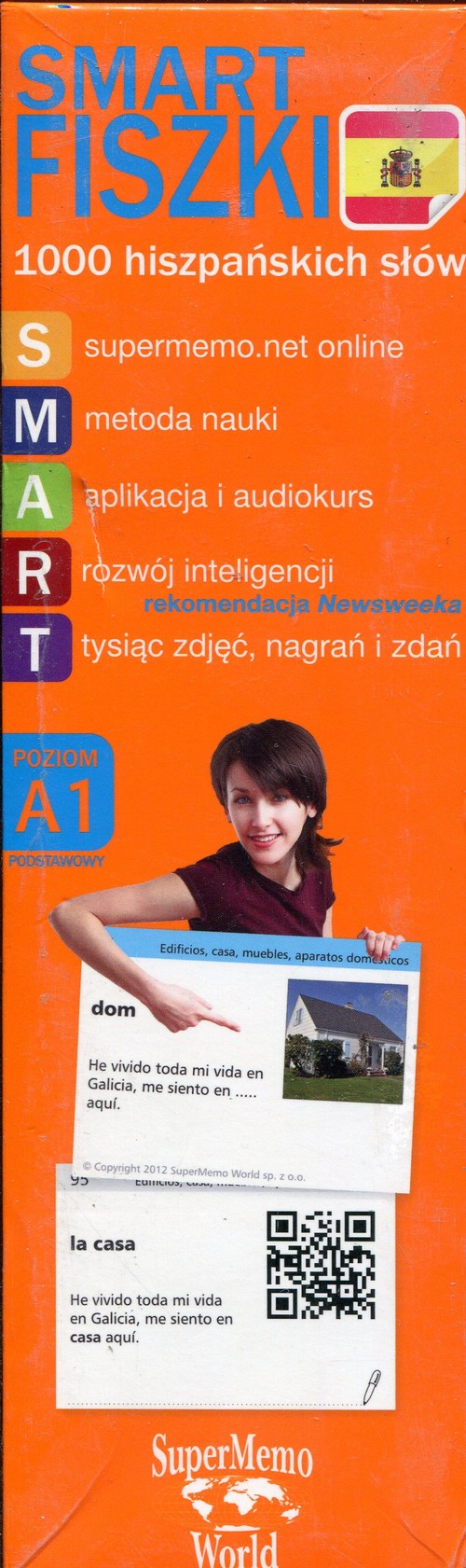 Karteczki do samodzielnej nauki podstawowych słówek hiszpańskich, z darmowym kursem online, audiokursem i aplikacją czytającą kody obrazkowe. SMARTfiszki umożliwiają naukę słówek na wiele sposobów. Można przeglądać i powtarzać porcję fiszek w autobusie lub pociągu, jednocześnie słuchając audiokursu z nagraniami ich zawartości. Proponujemy też darmowy dostęp do serwisu szybkiej nauki supermemo.net, w którym proces nauki wspiera wielokrotnie nagradzana i poparta badaniami naukowymi metoda SuperMemo. Fiszki prezentują poziom A1 według skali Rady Europy. Zawartość pakietu: •1000 kolorowych fiszek ze zdjęciami •Nagrania wszystkich słówek i zdań przykładowych do odsłuchania bezpośrednio z fiszki przy pomocy iPhone’a lub smartfonów z systemem Android, do pobrania ze strony www.smartfiszki.pl •Kod umożliwiający naukę słownictwa z fiszek online w serwisie supermemo.net przez 6 miesięcy gratis •Audiokurs w formie plików MP3 do nauki ze słuchu, do pobrania ze strony www.smartfiszki.pl •Praktyczne przekładki oraz kalendarz powtórek wraz z instrukcją Fiszki w pudełku W pudełku znajduje się 1000 fiszek, 41 przekładek oraz przewodnik. Fiszki ułożone są ułożone są w 15 rozdziałach tematycznych: Życie i świat przyrody, flora i fauna, Ciało człowieka, cechy fizyczne, zdrowie i śmierć, Ludzie i rodzina, Budynki, dom, meble, wyposażenie gospodarstwa domowego, Cechy charakteru, wrażenia zmysłowe i uczucia, Ludzie i społeczeństwo, Edukacja, poglądy i komunikacja, Kultura i historia, Ubrania, materiały, przedmioty, sprzęt i substancje, Nauka i technologia, medycyna, rolnictwo, Gospodarka, handel, bankowość, wartość i pieniądze, Czas i przestrzeń, Przemieszczanie się, transport i podróże, drogi, Pojęcia ogólne i abstrakcyjne, Podstawowa gramatyka. Każdy rozdział oznaczony jest innym kolorem paska górnego. Wewnątrz rozdziałów fiszki są ułożone frekwencyjnie, zaczynając od najczęściej używanych w języku. Na froncie fiszki znajdują się: słówko polskie, zdjęcie, zdanie z luką oraz oznaczenie rozdziału i numer kolejny fiszki. Z tyłu fiszki można znaleźć: słówko hiszpańskie, pełne zdanie i kod obrazkowy oraz miejsce na dopisanie własnych notatek. Audiokurs Oferuje możliwość nauki ze słuchu słówek hiszpańskich z polskimi tłumaczeniami. Zawiera prawie 4 godziny nagrań w formacie MP3 w układzie aktywnym (z polskiego na hiszpański) i pasywnym (z hiszpańskiego na polski). Nagrania są wykonane przez profesjonalnych lektorów hiszpańskich i polskich. Aplikacja na iPhone’a i smartfony Aplikacja na iPhone’a i smartfony z systemem Android umożliwia odsłuchanie nagrań na podstawie zeskanowanych kodów z fiszek. Szczegóły i darmowa aplikacja są do pobrania na stronie www.smartfiszki.pl. Kurs online Pakiet zawiera kod umożliwiający bezpłatną naukę przez 6 miesięcy w serwisie szybkiej nauki online na stronie www.supermemo.net, z możliwością przedłużenia. Oferujemy możliwość nauki z kursu „Espanol Extremo 1: Básico”, który zawiera treść fiszek. Nauka w kursie z metodą SuperMemo pozwala trwale zapamiętać treść kursu w zaskakująco krótkim czasie. Wymagania sprzętowe: •Dla aplikacji „Czytnik kodów” – iPhone/iPod z kamerą (iOS4 lub nowszy) lub smartfon z Androidem w wersji 2.1-2.3 posiadający kamerę z opcją autofokus. •Dla audiokursu – dowolny odtwarzacz MP3.