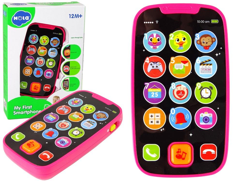 Smartfon Telefon Dotykowy Dla Niemowląt Dźwięk Różowy Maluszki słyszą pierwsze dźwięki już w łonie swej mamy. Przyzwyczajone do odgłosów bicia serca, bardzo pozytywnie reagują na podobne odgłosy. Sprawdź sam, jak wybrane dźwięki wpływają na dziecko, ułatwiając mu uspokojenie się. Smartfon odznacza się lekką wagą i małymi wymiarami, idealnymi do rączek dzieci. Dotykowy telefon reaguje na dotyk palca maluszka. Na ekranie zobaczymy 14 przycisków, pod każdym z nich kryją się inne melodie i słowa. Na przyciskach ze zwierzątkami usłyszymy odgłosy, jakie wydaję, wesołe dźwięki oraz nazwę cyferki, pod którymi się kryją. Pozostałe przyciski to odgłosy między innymi bicia serca, tykającego zegara czy klikania na kalkulatorze. Naciskając zielona słuchawkę, usłyszymy dźwięki wybierania numeru telefonu oraz sygnał połączenia. Ten typ telefonu to edukacyjna zabawka nie tylko absorbująca uwagę na długi czas, ale i rozwijająca. Różnorodne dźwięki pozytywnie wpłyną na słuch dziecka, natomiast obrazki i ukryte pod nimi funkcje rozwiną logiczne myślenie i zdolności manualne maluszka. Zabawka posiada: - 14 dotykowych przycisków, - przełącznik ON/OFF, - przycisk uruchamiający smartfon Wymiary smartfonu: 13 cm x 7 cm x 2 cm Wymiary opakowania: 18 cm x 13 cm x 4 cm Zabawkowy telefon dotykowy przeznaczony jest dla wszystkich dzieci powyżej 12. miesiąca życia. Budowa zabawki jest bardzo prosta, posiada opływowe kształty pozbawione ostrych, niebezpiecznych zakończeń. Komórka została wykonana z lekkiego, atestowanego plastiku, posiada certyfikat CE, będący gwarancją spełnienia wymaganych norm Unii Europejskiej.