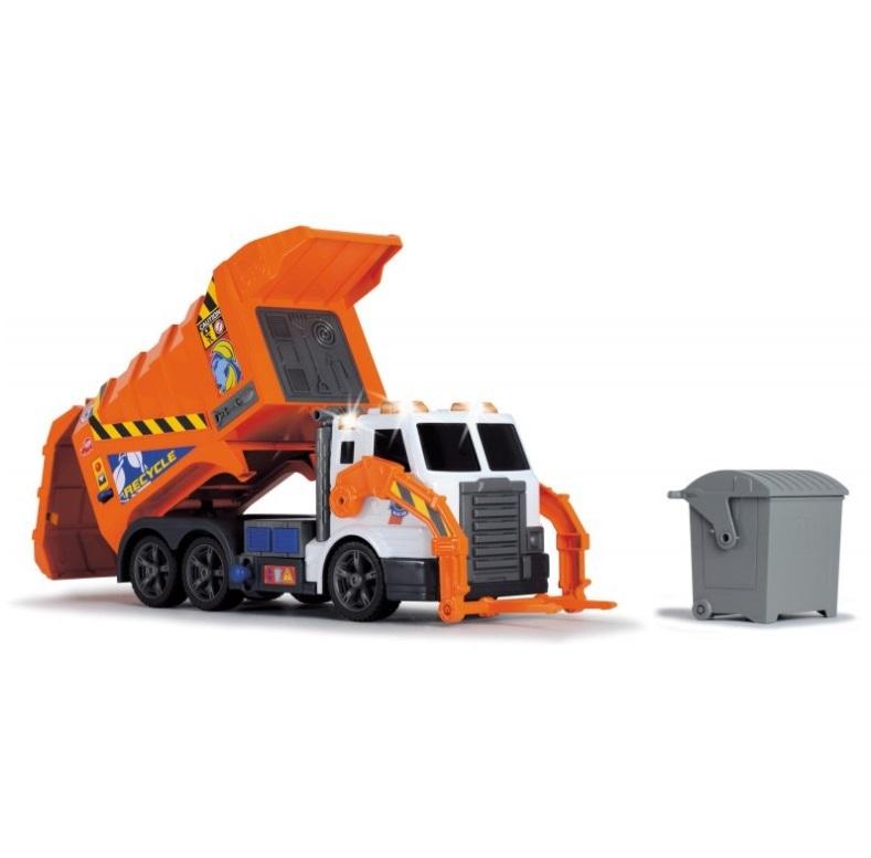 Śmieciarka pomarańczowa z dźwiękiem i światłem 1137000 na pewno zachwyci każdego chłopca! Pojazd wyposażono w napędzaną dźwignię do podnoszenia i opuszczania kontenera, naczepę można przechylać do tyłu, by opróżnić jej zawartość. Niewątpliwie dodatkowym atutem są efekty dźwiękowe (pracy silnika, dźwięk cofania, wysypywania odpadów) i świetlne (migające pomarańczowe światło).