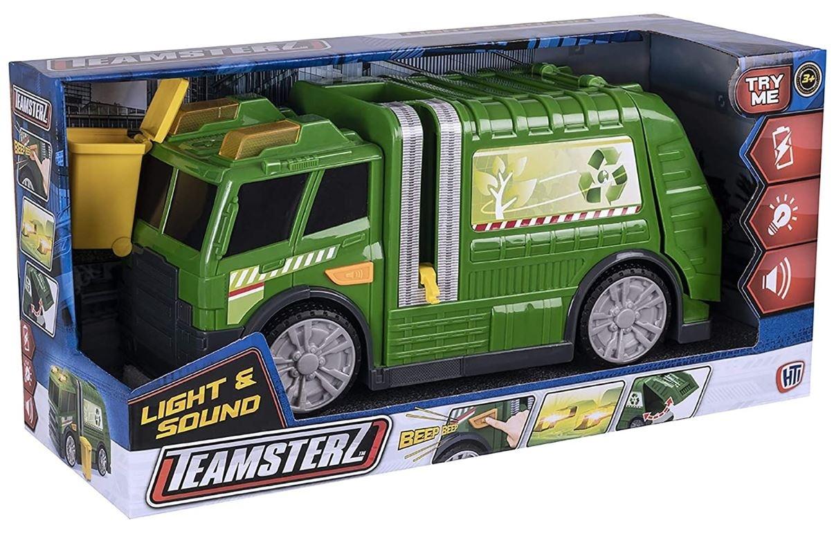 Zadbaj o swoje miasto i ekologię razem ze śmieciarką TEAMSTERZ! Pojazd został wyposażony w ręcznie otwieraną tyną klapę na śmieci. Dołączony kosz mocuje się do pojazdu, aby opróżnić śmieci z pojemnika na odpady. Zawiera żółte migające światła i realistyczne dźwięki. Ten wyjątkowy pojazd świetnie pobudzi wyobraźnię, wspomoże rozwój społeczny i zdolności motoryczne dziecka, a także rozwinie umiejętność koordynacji ręka-oko. Zasilany 3 bateriami AAA (w zestawie).