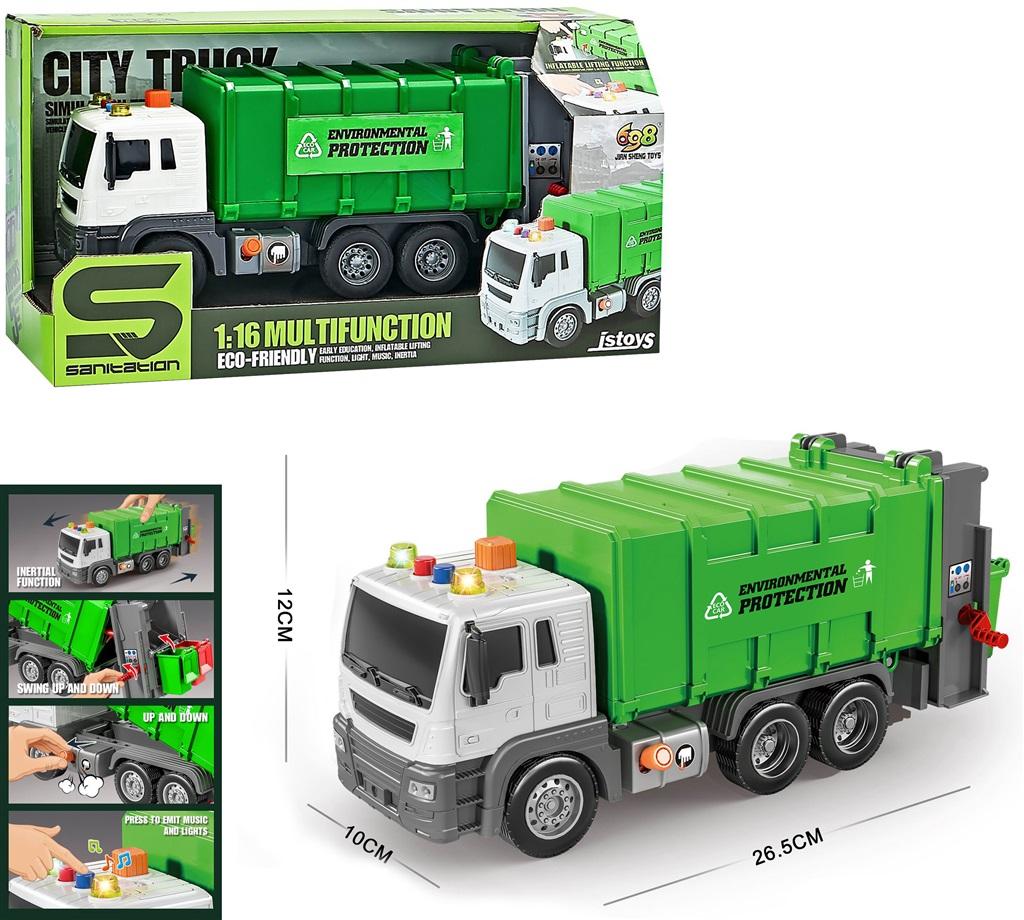 Plastikowe auto śmieciarka. Autko na dachu szoferki posiada kilka przycisków, po naciśnięciu których auto wydaje dźwięki samochodu oraz świeci światłami.