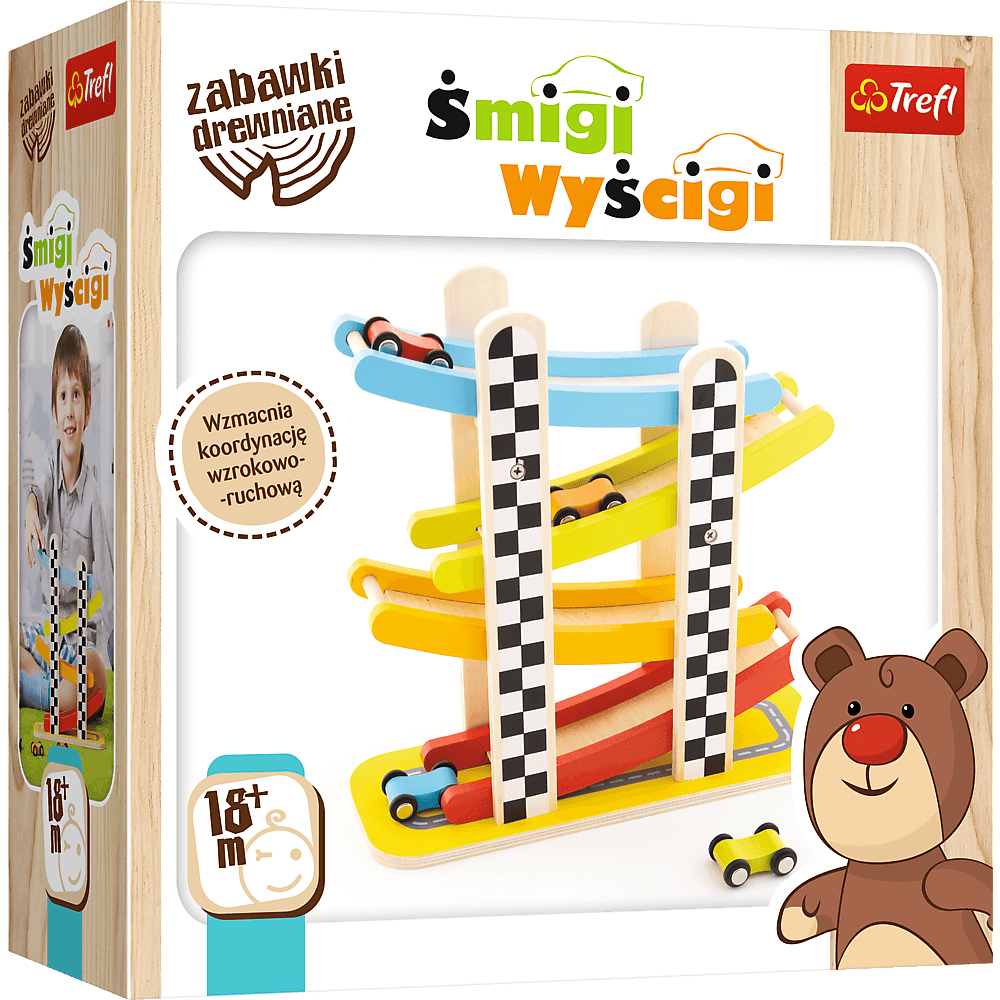 Cztery kolorowe samochodziki i tyle samo poziomów zjazdów zachęcają do wspólnej zabawy, wzmacniając dodatkowo koordynację wzrokowo-ruchową