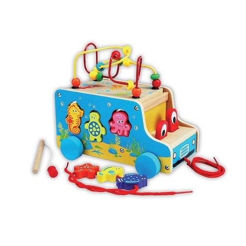 AUTO 5 W 1 Auto 5 w 1 to wielofunkcyjna zabawka do ciągnięcia. Zapewni dziecku wielogodzinną zabawę pełną atrakcji. Auto ma sznureczek do ciągnięcia i chętnie wyruszy z maluchem w podróż. Podczas spaceru zabawne oczy umieszczone na masce poruszają się. Na dachu pojazdu znajduje się labirynt do przeplatania kolorowych koralików, który można schować do środka. Boki auta to sorter gdzie można dopasowywać klocki w kształcie zwierzątek morskich. Zwierzątka można także nawlekać na sznurek, a dzięki wbudowanym maleńkim magnesom zabawka jest także zręcznościową grą w łowienie rybek. Auto 5 w 1: • To ciągacz • Sorter • Zabawki do nawlekania • Gra w łowienie • Kolorowy labirynt Auto 5 w 1 pomaga rozwijać umiejętności: • Poznawcze – ciekawość • Rozwój fizyczny – mała motoryka • Rozwój społeczny - emocje Specyfikacja: • AC6665 • Wiek: 18m+ • EAN: 5905375829674 • Wymiary produktu: szer. 15 cm. wys. 21 cm., gł. 25 cm. • Bezpieczeństwo: EN71-1, EN71-2, ENT1-3 • Importer: Anek dla Dzieci