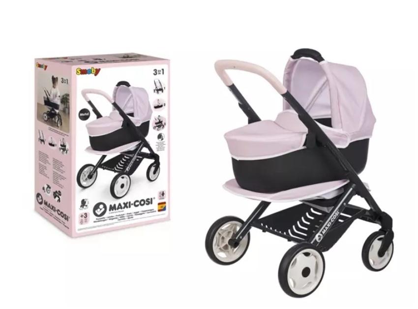 Wielofunkcyjny wózek 3w1: gondola, spacerówka i wózek głęboki. Łatwy montaż, oryginalne wzornictwo Maxi Cosi. Metalowa konstrukcja, gumowe, skrętne przednie koła, ergonomiczne uchwyty, koszyk na drobiazgi. Dla lalek do 42 cm (lalki brak w zestawie).Rączka na wysokości 64 cm. Wyprodukowano w Hiszpanii.