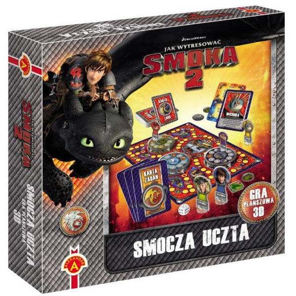 Mieszkańcy Berku postanowili wyprawić wielką ucztę. Młodzi jeźdźcy smoków zostali poproszeni o pomoc w przygotowaniach i zebrania poza wioską rzadko spotykanych składników potraw: aromatycznych ziół do doprawienia mięsa, krystalicznej wody potrzebnej do lemoniady i wybornych jagód do deseru. Nastoletni Wikingowie postanawiają potraktować tę prośbę jako początek przyjacielskiej rywalizacji i ustalają zasady podniebnego wyścigu. Tytuł najlepszego jeźdźca zdobędzie ta osoba, która jako pierwsza zbierze zamówione składniki i przyniesie je do wioski. Rywalizację czas zacząć. Zawartość opakowania: plansza, 12 elementowy podest, 5 pionków, 5 podstawek do pionków, kostka, 10 kart losu, 15 kart zadań, 10 żetonów akcji, 15 żetonów składniki, instrukcja. 2-5 graczy 5+