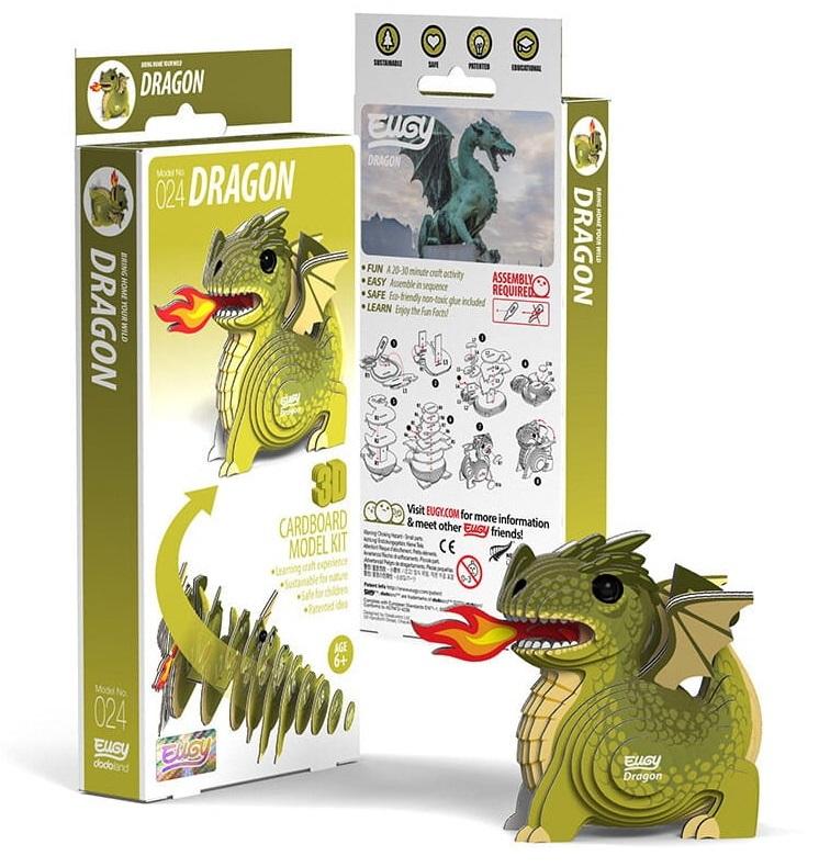 Eugy zaprojektowane w Nowej Zelandii są wykonane z przyjaznego dla środowiska kartonu pochodzącego z recyklingu i farby na bazie ryżu. Zestaw zawiera ponumerowane elementy układanki, nietoksyczny klej oraz instrukcję do zbudowania smoka. Zbierz całą serię zwierząt, ptaków, dinozaurów i wiele innych. Dla dzieci w wieku 6 lat+.
