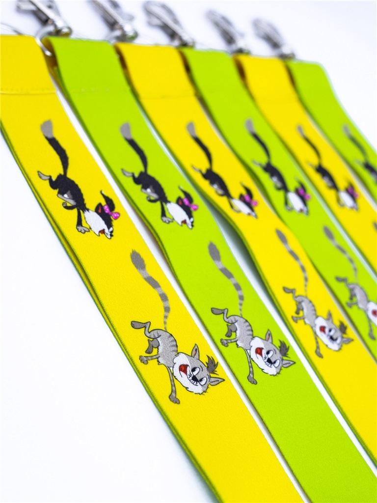 Smycz Cukierku, Ty łobuzie!. Nadruk, dwustronny, zakończona metalowym karabińczykiem, złączka bezpieczeństwa z tworzywa sztucznego.